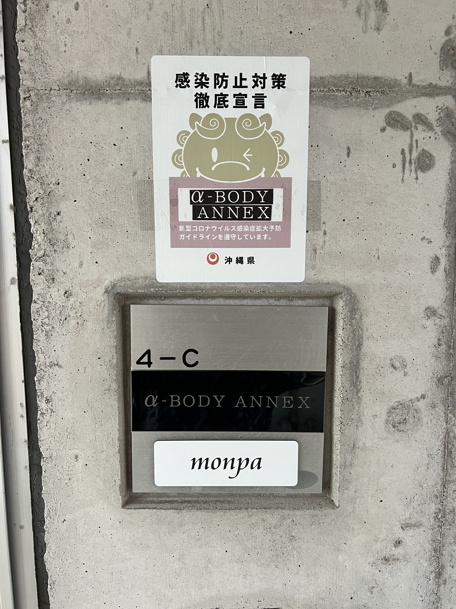 建物裏まで回っていただきますと1階に『α-BODY ANNEX &monpa』お客様専用駐車場がございます。